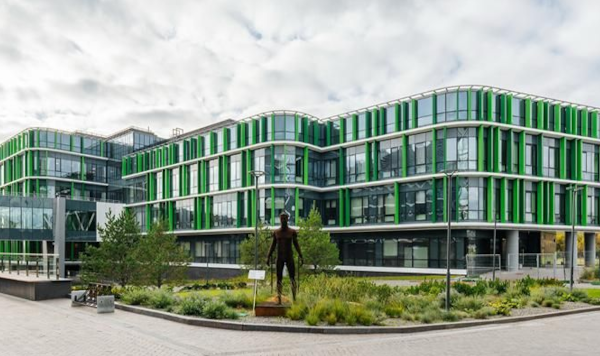 Возле центра высадили кустарники и уложили газон, обустроили зоны отдыха, пешеходные дорожки, велопарковку, установили малые архитектурные формы. Там появилась инсталляция «Блокчейн» - фигура человека из металлических цепей, что символизирует слияние цифрового и физического миров.