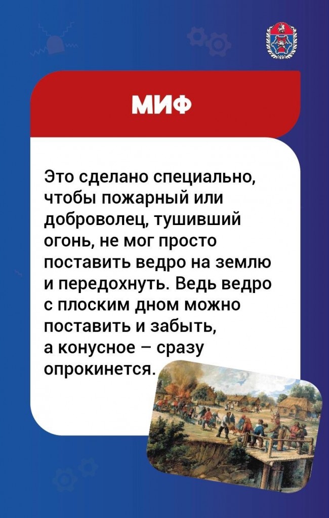 Один из главных мифов, которым объясняется именно такая форма пожарного ведра, звучит как шутка: якобы это сделано специально, чтобы пожарный или доброволец, тушивший огонь, не мог просто поставить ведро на землю и передохнуть. Ведь ведро с плоским дном можно поставить и забыть, а конусное – сразу опрокинется. На самом деле у такой конструкции есть практические причины, никак не связанные с этим мифом.