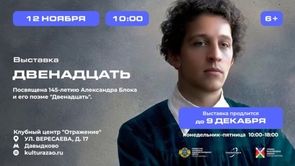 12 ноября в клубном центре «Отражение» откроется выставка «Двенадцать». Как сообщили в управе Можайского района, она посвящена 145-летию со дня рождения поэта Александра Блока и его знаменитой поэме.