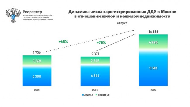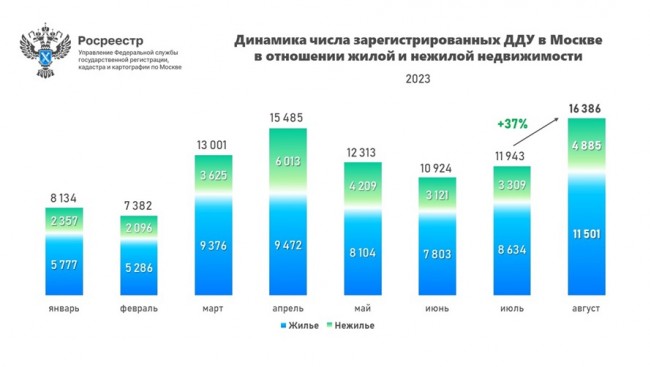 В августе 2023 года Управлением Росреестра по Москве зарегистрировано 16 386 договоров долевого участия в отношении жилой и нежилой недвижимости. Данный показатель на 37,2% превышает число первичных сделок в июле текущего года (11 943 ДДУ).
