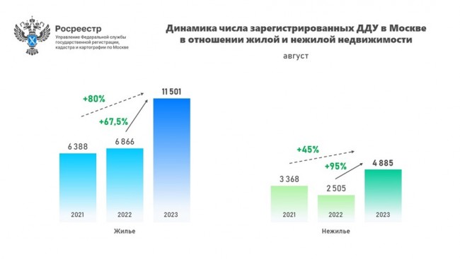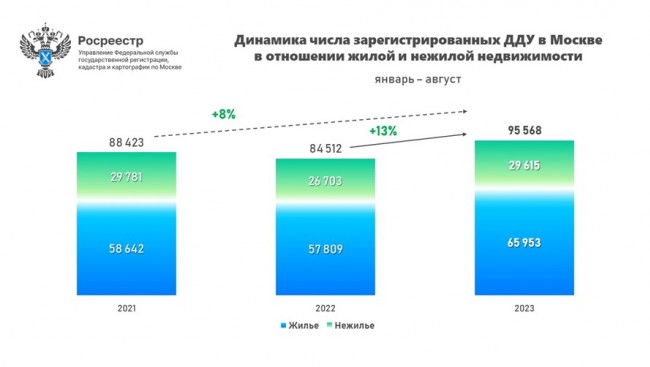 Всего в январе-августе 2023 года в Москве зарегистрировано 95 568 договоров долевого участия в строительстве в отношении жилой и нежилой недвижимости. Данный показатель на 13,1% превышает результат января-августа прошлого года (84 512 ДДУ), а к аналогичному периоду 2021 года (88 423 ДДУ) рост составил 8,1%.